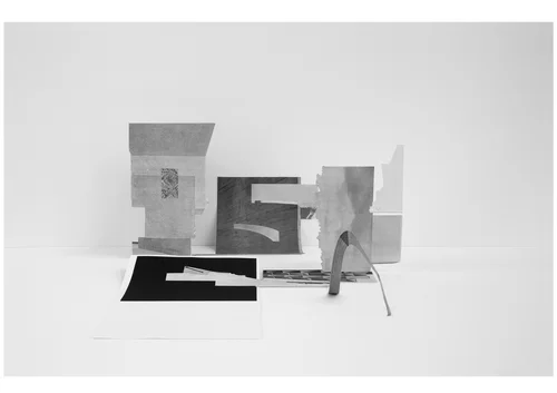 Im rechten zwei Blätter, ebenfalls auf Messingstäben raumlassend. Das hintere scheint mit einem Text durch das bewusst dünn gewählte Archivpapier des vorderen, lässt sich aber nicht lesen. Das vordere Blatt zeigt zwei Bilder. Das untere Bild auf das Blatt gedruckt, ist eine Fotografie, vermutlich aufgenommen in den 1950er Jahren. Schwarz-weiß, die Stadtlandschft im Hintergrund leer. Darauf zwei Männer, gebeugt über eine Treppe, darauf ein Objekt, unförmig mit Blättern auf schwarzem Grund. Sie beschauen das Bildobjekt darüber ein Bild, angebracht als Objekt schwebend vor dem Blatt, unförmig geschnitten, der Anriss einer Treppe, vor schwarzem Grund Blätter oder Farne. Die Kästen lassen Raum.